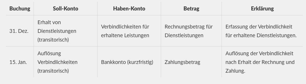 Ein Unternehmen schließt am Ende seines Geschäftsjahres, also am 31. Dezember, einen Vertrag über Dienstleistungen ab. Die Dienstleistungen werden jedoch erst im nächsten Geschäftsjahr, am 15. Januar, erbracht. Das Unternehmen erhält die Rechnung für die Dienstleistungen erst nach der Erbringung der Leistungen.