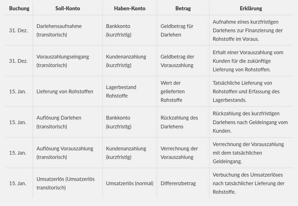 Ein Unternehmen schließt am Ende seines Geschäftsjahres, also am 31. Dezember, einen Vertrag über die Lieferung von Rohstoffen ab. Die Lieferung und Rechnungsstellung finden jedoch erst im nächsten Geschäftsjahr, am 15. Januar, statt. Das Unternehmen hat die Rohstoffe bereits vorab finanziert und die Zahlung erfolgt zum Zeitpunkt der Lieferung.