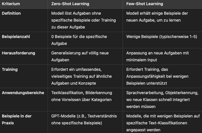 Ein verwandter Ansatz ist das Few-Shot Learning, bei dem das Modell mit wenigen Beispielen für eine neue Klasse vertraut gemacht wird, anstatt mit vielen (wie beim überwachten Lernen). Während ZSL ganz ohne Beispiele auskommt, nutzt Few-Shot Learning wenigstens einige gelabelte Datenpunkte zur Feinabstimmung. ZSL ist in Szenarien nützlich, in denen selbst wenige Beispiele schwer zu beschaffen sind oder eine schnelle Skalierung benötigt wird.