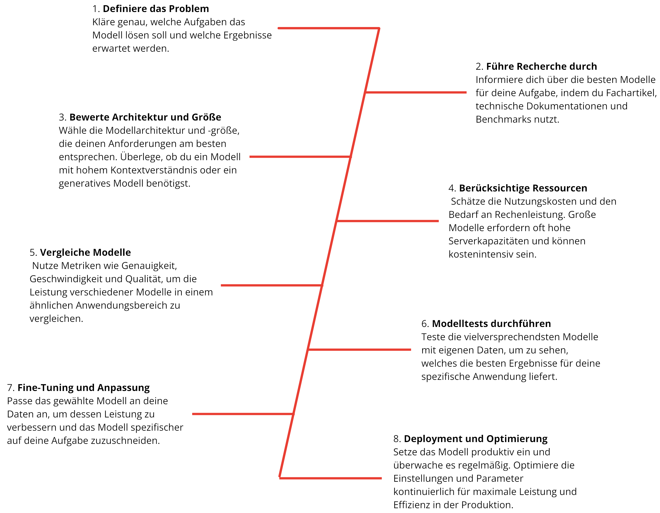 Darüber hinaus solltest du deine verfügbaren Rechenressourcen berücksichtigen. Hast du Zugang zu leistungsstarken GPUs oder TPUs? Wie viel bist du bereit, für Rechenleistung und Modellnutzung auszugeben? Muss das Modell skalierbar sein, um mit hohem Verkehrsaufkommen umgehen zu können? Schließlich ist es wichtig zu überlegen, ob du ein spezialisiertes Modell benötigst. Wenn du in einem spezifischen Bereich wie Medizin, Recht oder Technik arbeitest, könnte spezielles Fachwissen erforderlich sein. Auch die Sprache oder die Unterstützung von weniger verbreiteten Sprachen und Dialekten spielt eine Rolle. Vergiss nicht, eventuelle gesetzliche Vorschriften oder Datenschutzbestimmungen zu beachten.