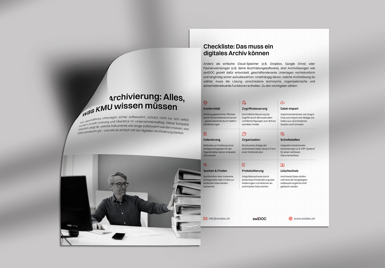 Endlich mehr Zeit für das, was zählt: swiDOC nimmt dir die Archivierung ganz einfach ab - automatisch, gesetzeskonform, ohne Papierchaos und ohne Aufwand. Einfach entspannter arbeiten.