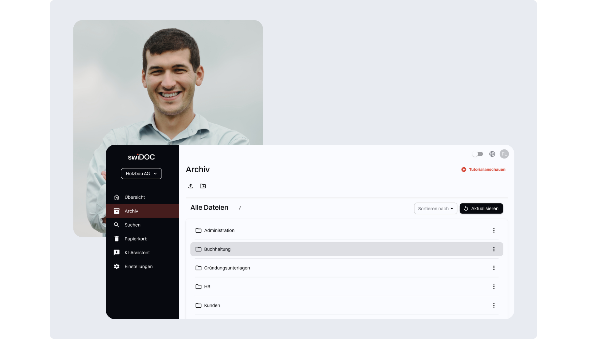swiDOC ist die einfachste Archivierungslösung für Schweizer KMU: rechtskonform, sicher und völlig papierlos. Finde Verträge, Rechnungen und E-Mails dank KI in Sekunden wieder – ohne Installationen, ohne Schulungen. So sparst du dir Ordner und Vorschriften und hast den Kopf frei fürs Geschäft.