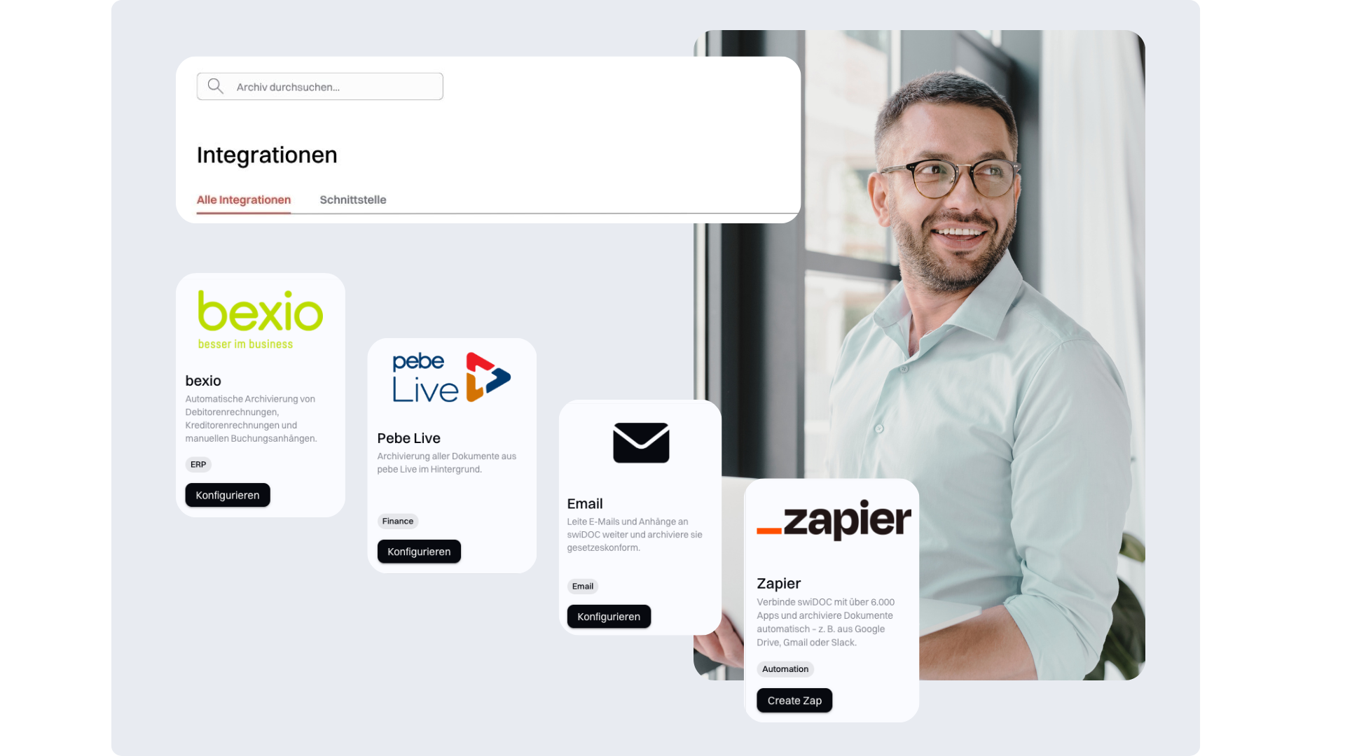 Verbinde swiDOC mit deiner Business-Software und archiviere direkt aus deinen Lieblingstools. Wichtige Dokumente werden automatisch abgeholt und rechtssicher abgelegt.